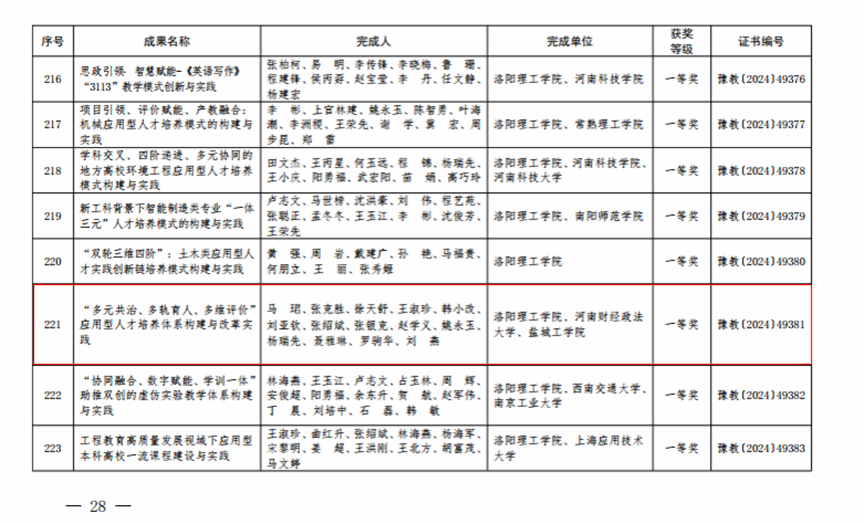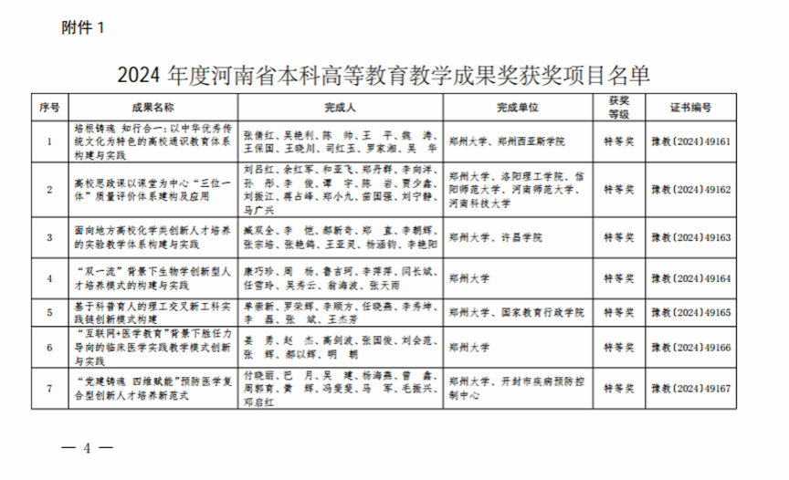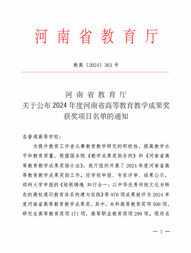 近日,河南省教育厅发布《关于公布2024年度河南省高等教育教学成果奖获奖项目名单的通知》,bb贝博艾弗森官方网站作为完成单位、罗驹华教授作为完成人的《“多元共治、多轨育人、多维评价”应用型人才培养体系构建与改革实践》获得高等教育教学成果一等奖。