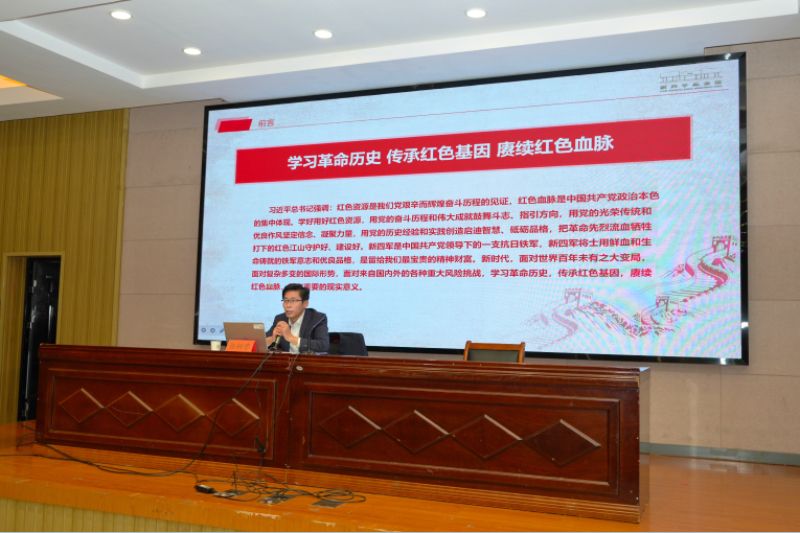 张树忠以习近平总书记考察新四军纪念馆时的重要讲话开场,通过详实的图片、生动历史故事和系列文史资料,从新四军诞生的历史背景、新四军的起源与组建发展、新四军的当代传承及意义等三个方面,讲述了新四军浴血奋战的光辉历史。他以学习新四军历史思考与启发结尾,结合当前国内外发展形势,引导青年大学生要学史明理、学史增信、学史崇德、学史力行,坚定信念跟党走,苦练本领强根基,同频共振谋发展,为大家上了一堂生动的思政课。