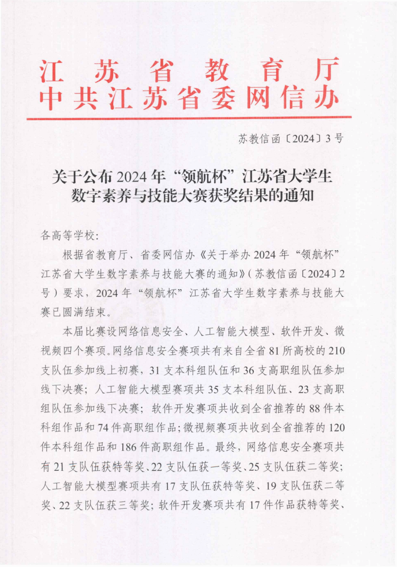 “领航杯”江苏省大学生数字素养与技能大赛由江苏省教育厅和江苏省委网信办联合主办,旨在全面落实国家和省教育数字化工作部署,深入推进《提升全民数字素养与技能行动纲要》,不断提升广大师生数字素养,持续深化信息技术与教育教学融合创新。该赛项也被江苏省人社厅纳入江苏省百万技能人才技能竞赛岗位练兵活动。