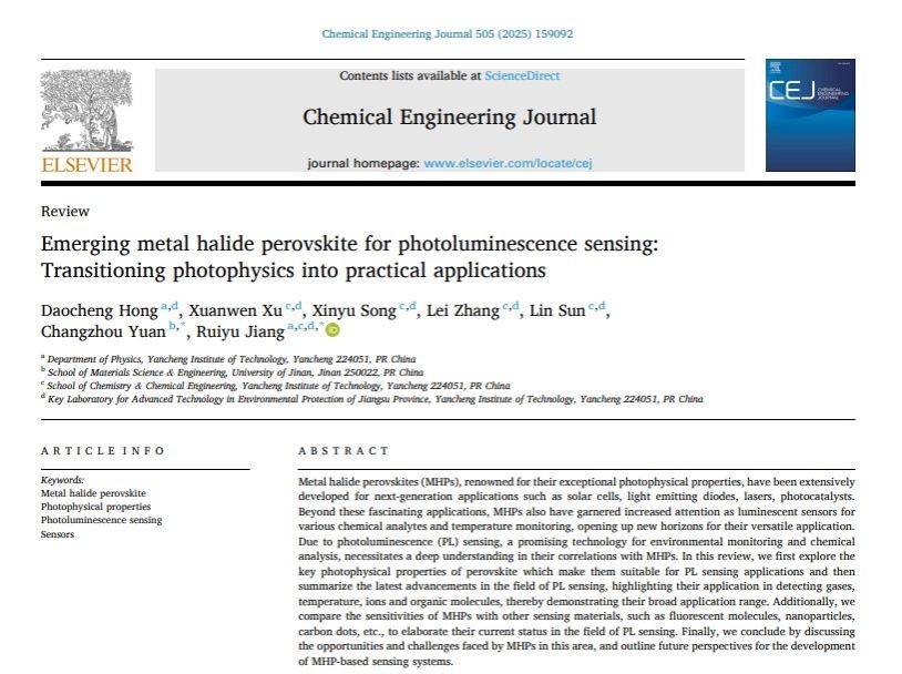 近日,贝博数理学院洪道程博士(第一作者)和姜瑞雨教授(通讯作者)与济南大学原长洲教授合作,以bb贝博艾弗森官方网站第一单位,在化工领域TOP期刊Chemical Engineering Journal(IF = 13.4)上发表题为Emerging Metal Halide Perovskite for Photoluminescence Sensing: Transitioning Photophysics into Practical Applications的学术论文。