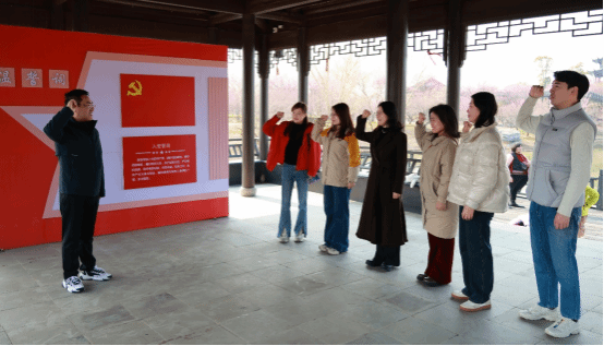 在梅花湾德政教育基地,教职工们依次参观了“识梅、抒梅、颂梅、赞梅”主题展区,株株凌霜盛放的梅花衬托着展区内“凌寒独自开”的诗句,坚韧不屈的气节自然而生;幽香扑鼻中,“只留清气满乾坤”的题词更令众人为梅花高洁的品格所震撼。当了解到“这片曾为贫瘠盐碱荒滩的土地,蜕变为如今兼具湿地生态与古典园林之美的‘水韵梅园’”时,教职工们无不感慨万千。梅花遇冷绽放的“蝶变精神”与盐碱地华丽转身的故事,成为激励大家勇毅前行的生动教材。在梅香萦绕的广场上,党员同志们庄严重温入党誓词,铿锵誓言中,践行初心使命的决心愈发坚定。