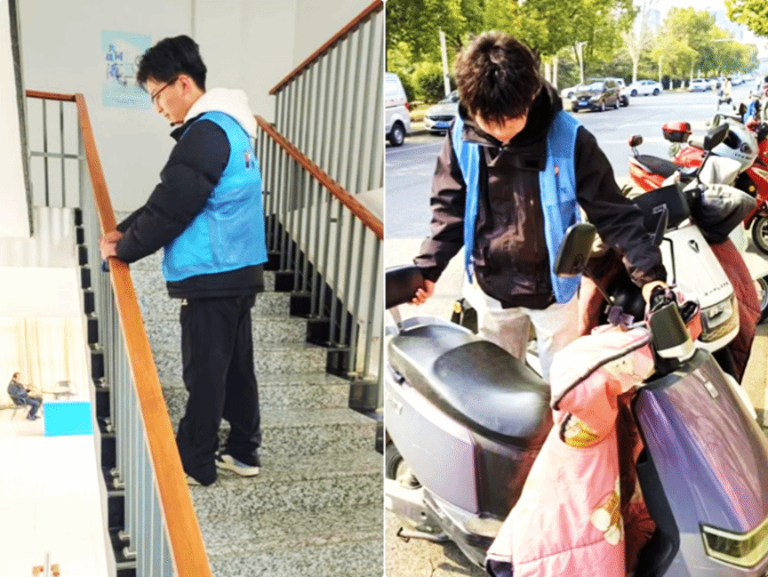 在校园环境美化行动中,志愿者们化身“环境卫士”,清理道路、绿化带中的垃圾,擦拭教学楼的扶手,并逐一撕除张贴在墙面、公告栏的违规小广告。经过数小时的劳动,教学楼与公共区域焕然一新。此外,志愿者们还主动承担起电瓶车停放秩序维护工作,将宿舍区、教学楼前的车辆摆放整齐,畅通校园通行空间。