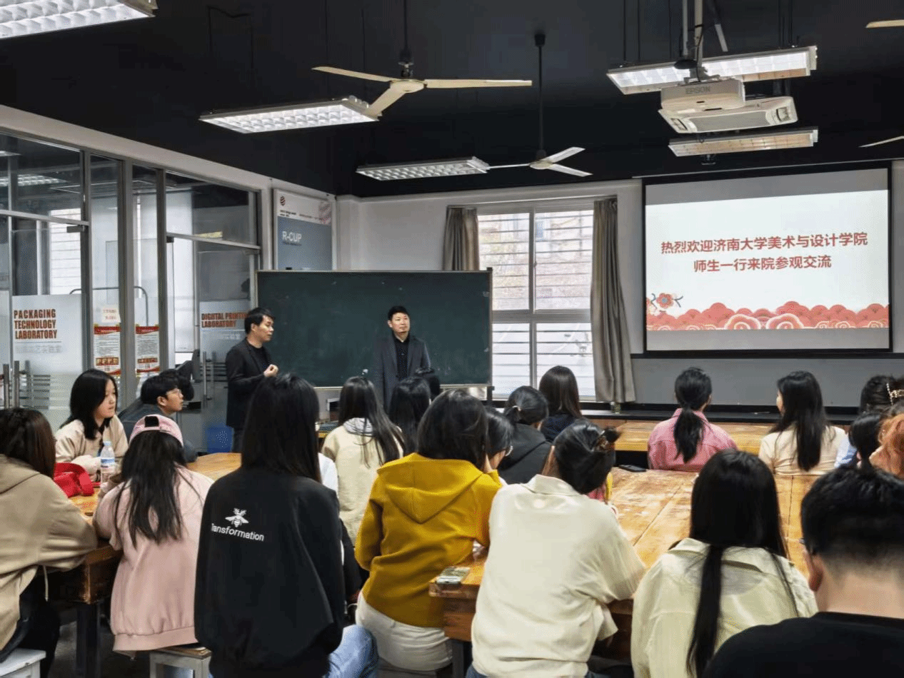 张军对济南大学美术与设计学院一行的到来表示欢迎,并详细介绍了设计艺术学院的办学历程、学科建设情况、美育教育成果、社会服务工作等方面的情况。