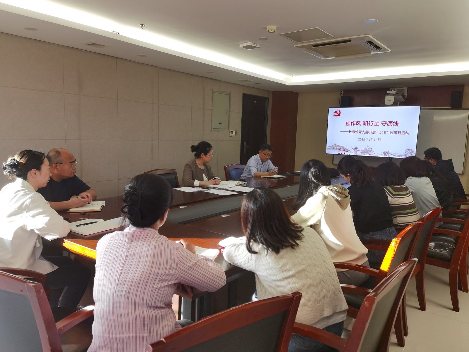 为扎实开展深入贯彻中央八项规定精神学习教育,筑牢教职工廉洁自律的思想防线,弘扬新时代廉洁文化,5月16日下午,教务处党支部在行政楼428会议室开展“510”思廉月警示教育。党支部书记余晓红主持会议,全体党员及科级以上干部参加。
