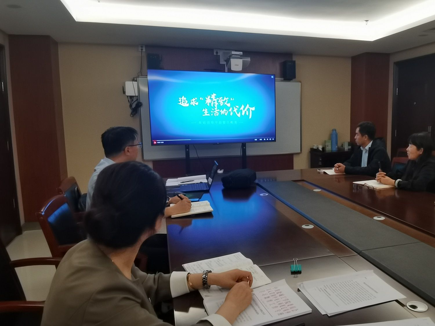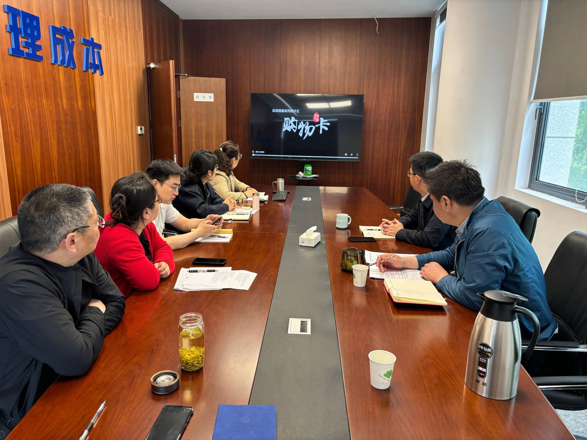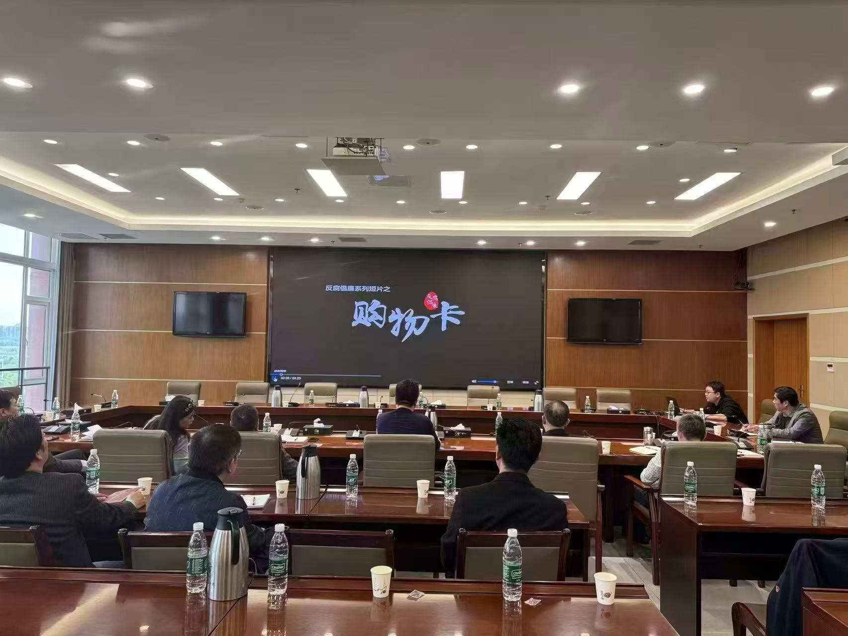 与会同志集中观看了《购物卡》《自带酒》《一篇论文》《“能”者多劳》等廉政警示教育微视频。