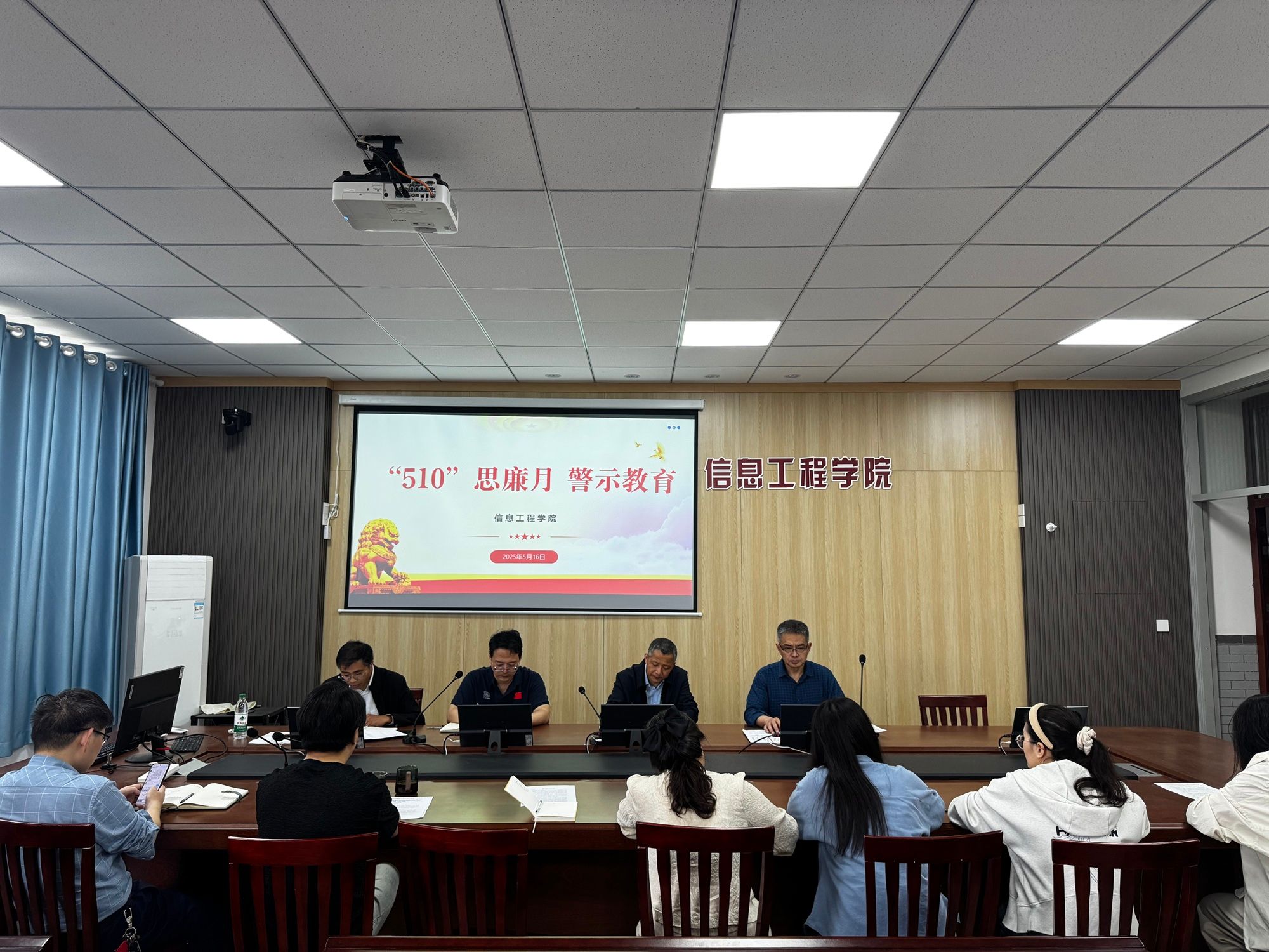 5月16日上午,信息工程学院党委在南校区怀德楼B410会议室组织开展“510”思廉月警示教育活动,会议由学院党委书记杨军主持,学院党委理论学习中心组全体成员参加。