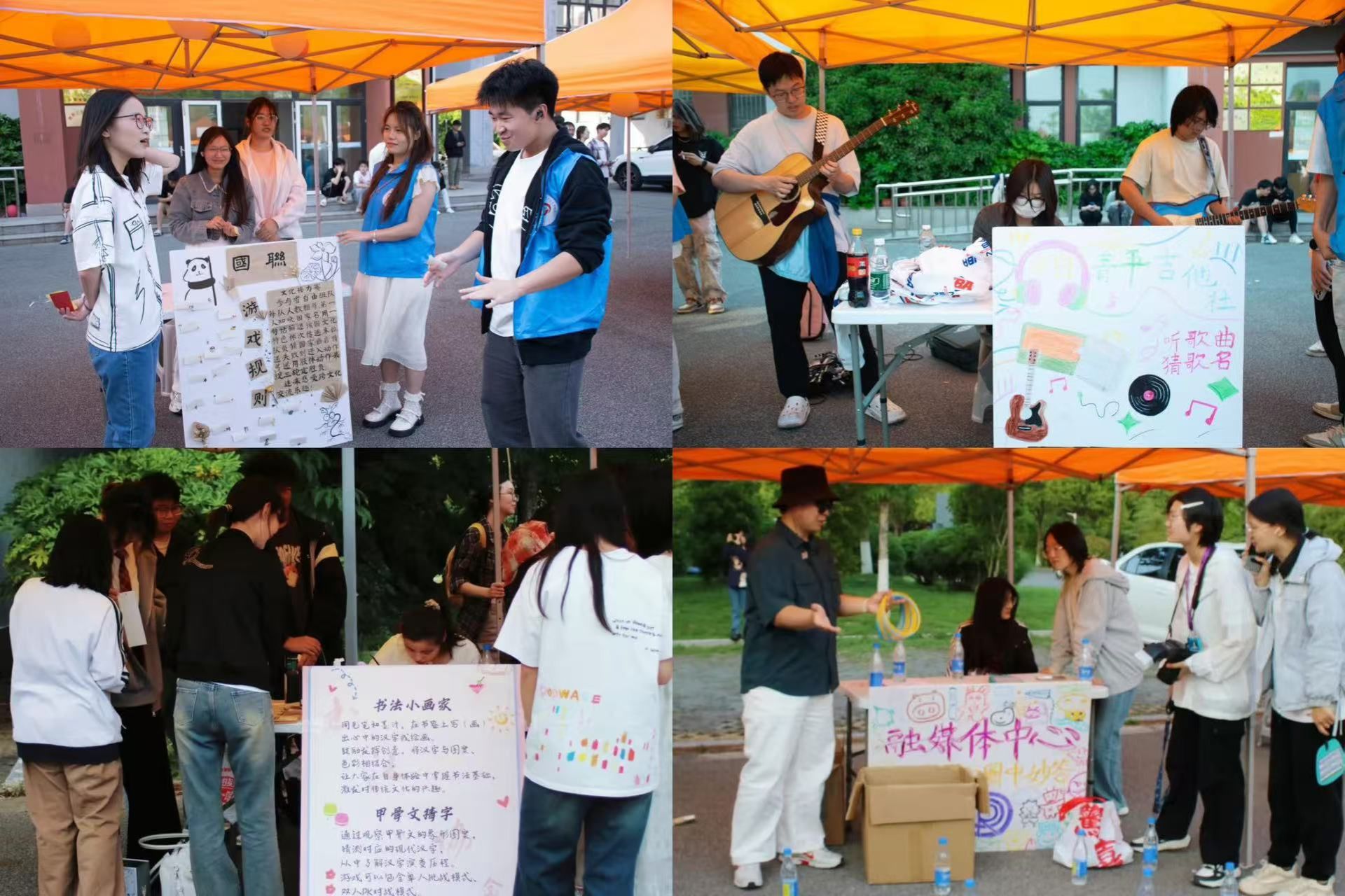 游戏互动区域同样精彩纷呈,各个社团精心设计的游戏项目吸引了众多师生驻足参与。融媒体中心的《套圈问答》别出心裁地将影视竞猜融入传统套圈游戏,参与者在投掷套圈的同时,还要快速回答影视相关问题,紧张刺激又充满趣味,成功引爆现场参与热情;摄影协会的《找不同》,用精心挑选的图片考验大家的观察力,让参与者在寻找细微差异的过程中,体会到发现的乐趣;旅游协会的《抽盲盒》,每个盲盒都蕴含着不同地区的风土人情小知识,让同学们在游戏中增长见识。书法协会的汉字游戏、国旗班的协作竞技等游戏也各具特色。科技协会的“量子雾珠” 游戏,将团队创作与科学元素相结合,成员们共同协作,发挥创意,制作出独特的“雾珠”作品;国际交流联合会的《文化接力赛》,通过知识问答、趣味挑战等环节,生动展现了世界多元文化的魅力。在这些游戏中,传统文化与现代科技相互交融,碰撞出耀眼的火花,让同学们在轻松愉悦的氛围中收获知识与快乐。