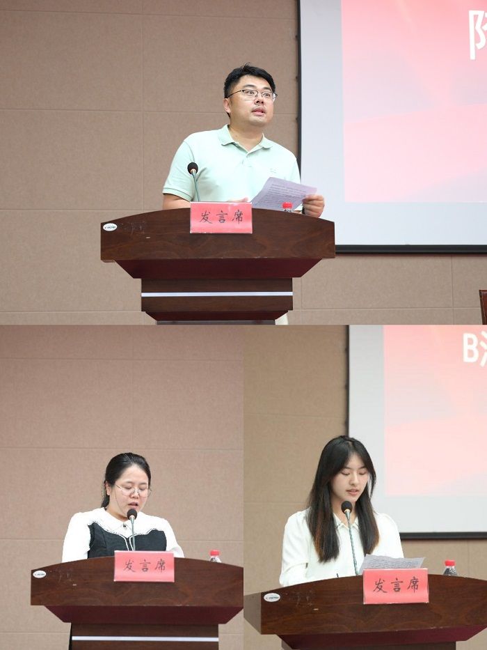 隋延鸣、夏斯蕾、王淼分别代表优秀教师代表、优秀学生干部代表发言