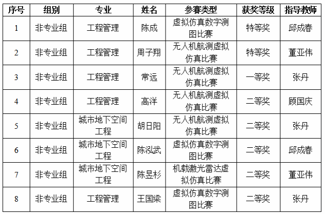 全国大学生测绘学科创新创业智能大赛2023年入选中国高等教育学会全国普通高校学科竞赛排行榜,是全国大学生展示测绘科技创新的最高级别赛事,共设置机载激光雷达虚拟仿真比赛、无人机航测虚拟仿真比赛、虚拟仿真数字测图比赛、测绘程序设计等4个子赛项,采用选手线上参赛、评委线下评审的方式进行。