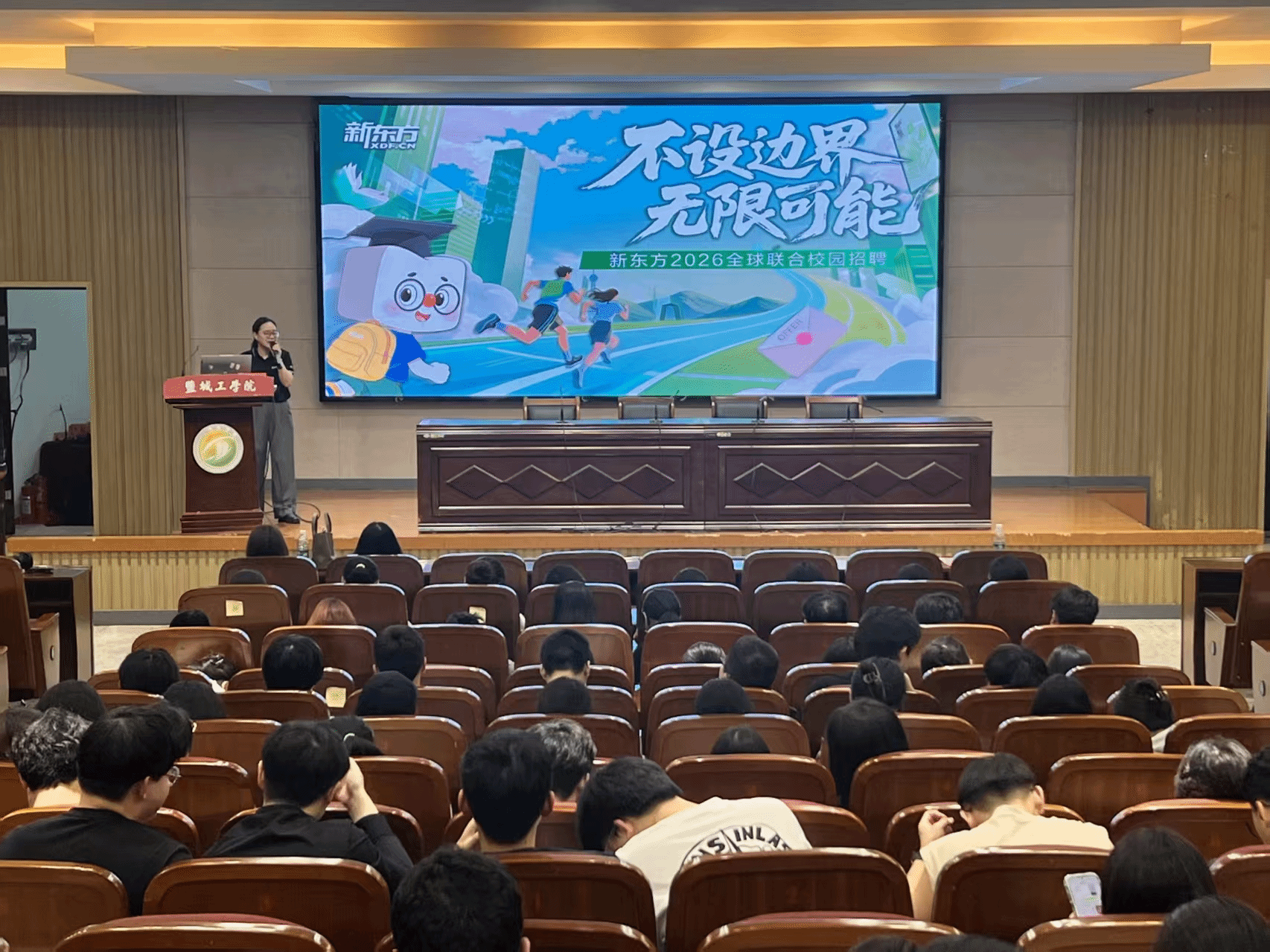 动员会后,新东方文化艺术有限公司进行校招宣讲,人力资源部主管陈露分别从企业发展历程、布局范围、多元化业务、人才需求特点及管培生培养体系、招聘岗位、薪资福利等方面进行了详细介绍,并与同学们进行互动交流。区域负责人曾茂结合自身职业经历,以生动朴实的语言,讲述了自己如何抓住机遇、迎接挑战、实现个人价值的真实故事。他的故事让抽象的“职业发展路径”变得具体而充满吸引力,极大地激发了学子们的投递热情。
