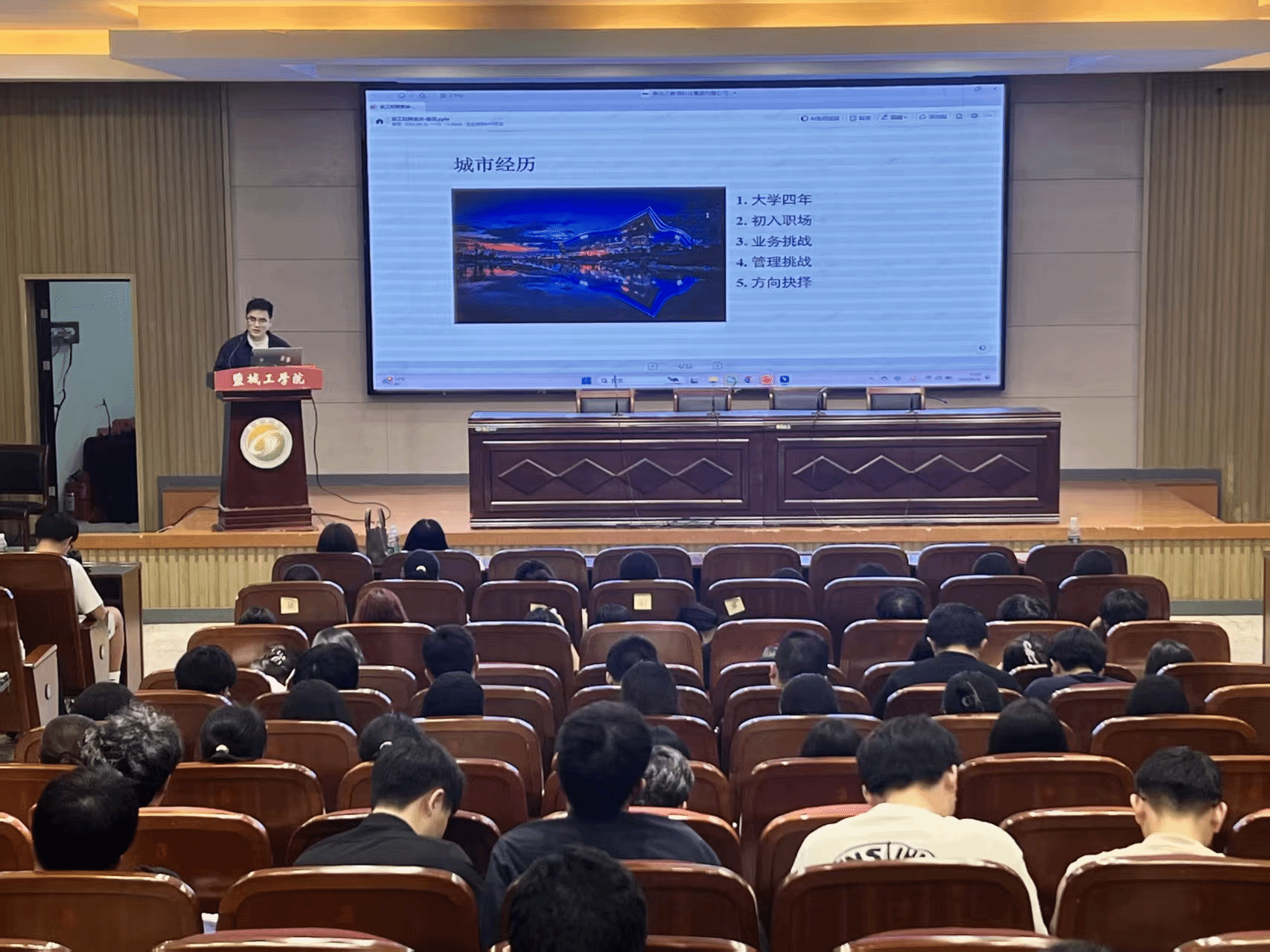 姚爱华结合当前就业工作作专题报告。她从国家发展战略、当前就业形势、社会人才需求、毕业生个人发展、秋招的重要性等角度进行深入讲解,并宣讲了盐城市黄海明珠2.0引才政策,她呼吁毕业生们,要树立正确的就业观念,适应多元化就业新常态;要把握好“金九银十”就业黄金期,精心筹备稳健起步;拓宽视野多渠道并进,积极挖掘就业新机遇;紧跟政策导向,深入基层建功立业。