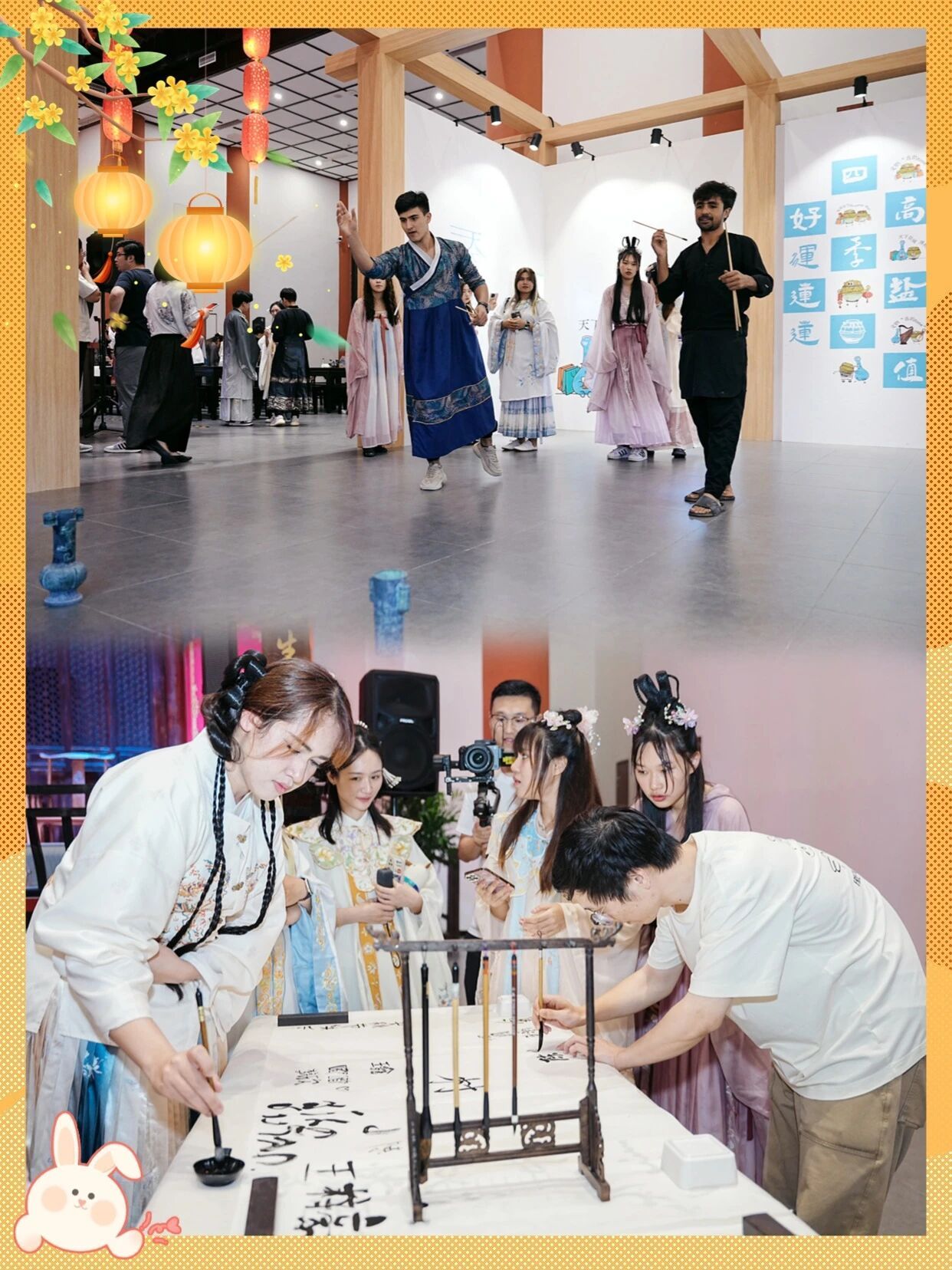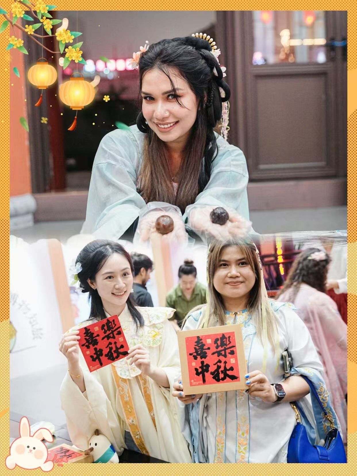 留学生们换上传统汉服,在讲解员的提灯引领下夜游博物馆。他们漫步于各个展厅,在静谧的夜色中聆听盐城的历史故事,感受千年文脉的流淌。在非遗展演中心,留学生们亲手制作了独具特色的“文物月饼”。从和面到压模,大家兴致盎然,在动手实践中深刻理解了中秋的团圆内涵。等待月饼烤制期间,留学生们还体验了书法临摹、投壶游戏等互动活动,留学生们挥毫写下“中秋快乐”,在趣味竞技中感受古人的雅趣,现场欢声笑语不断。活动尾声,留学生们移步至博物馆三楼露天平台共赏明月,在桂花树下悬挂亲手写下的许愿卡,为远方的亲人、也为在盐城的学习生活送上美好祝福。