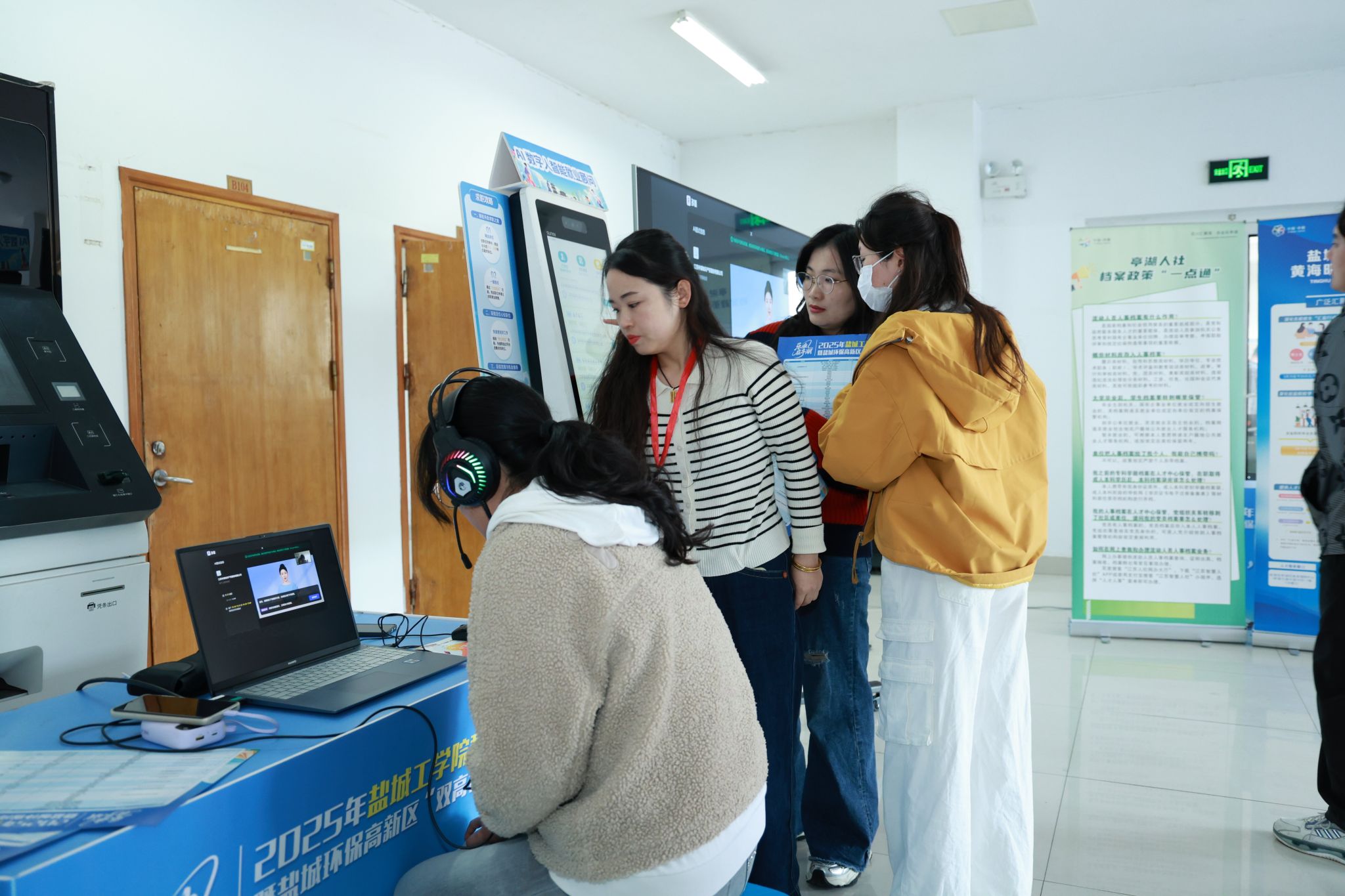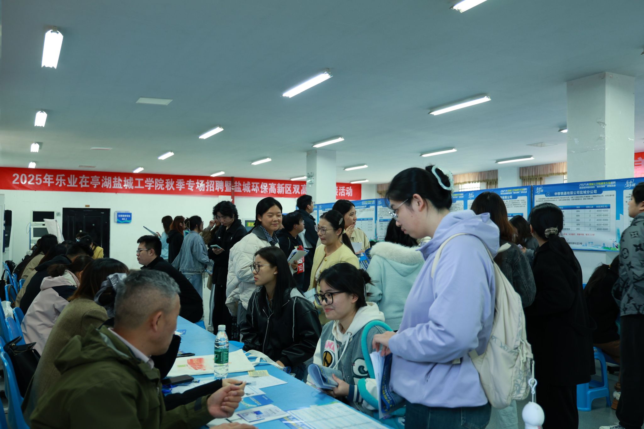 在希望大道校区一站式社区大学生就业市场同步举办了专场招聘活动。双选会现场气氛活跃,参会企业与毕业生围绕岗位需求、职业发展路径等问题深入交流,通过精准匹配实现高效对接。活动现场还创新推出城市宣传体验区,毕业生在体验活动中详细了解亭湖区招才引才政策,进一步增强“留盐”发展的意愿。
