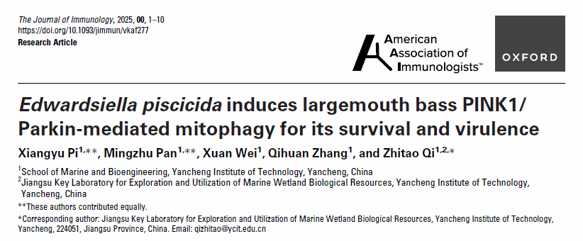 10月30日,海生学院齐志涛教授课题组在免疫学领域经典期刊The Journal of Immunology上发表了题为“Edwardsiella piscicida induces largemouth bass PINK1/Parkin-mediated mitophagy for its survival and virulence”的研究成果,揭示了大口黑鲈线粒体自噬在杀鱼爱德华氏菌感染中的作用及其免疫学机制。