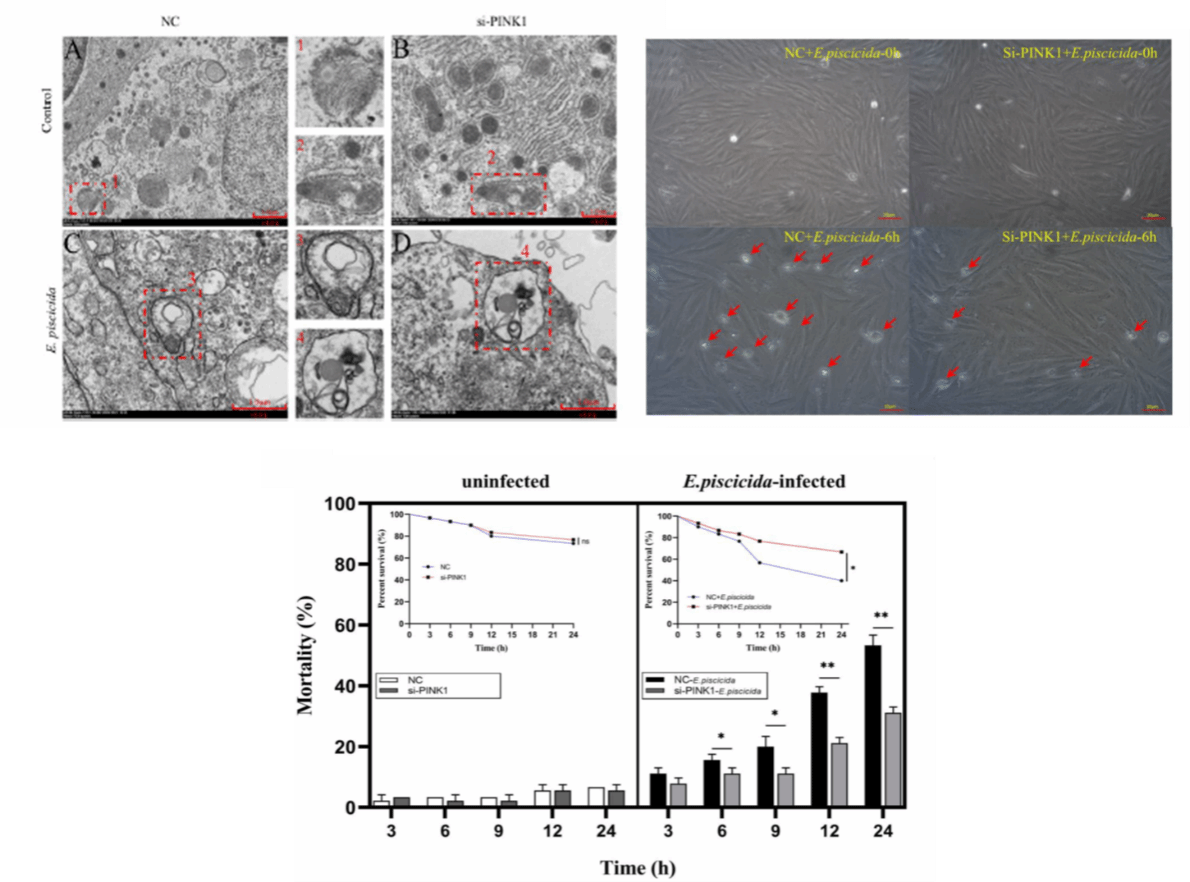 该研究在构建E. piscicida感染大口黑鲈个体模型和细胞模型的基础上,通过透射电镜、荧光染色、western blot等方法明确了E. piscicida感染能够导致大口黑鲈发生线粒体自噬。在此基础上,通过RNA干扰、透射电镜、western blot、荧光定量PCR等方法明确了E. piscicida诱导的线粒体自噬是由经典的线粒体自噬通路PINK1/Parkin所介导的。敲降PINK1基因能够显著降低E. piscicida的胞内增殖及感染E. piscicida后大口黑鲈死亡率,表明线粒体自噬的发生利于E. piscicida的胞内增殖及毒力的维持。之后,发现敲降PINK1能够抑制大口黑鲈piscidin-1、piscidin-3等抗菌肽基因及IL-10、TNF-α等炎性细胞因子基因的表达,提示PINK1途径通过抑制大口黑鲈的固有免疫及炎症反应而利于E. piscicida的胞内增殖。该研究首次揭示了大口黑鲈PINK1/Parkin介导的线粒体自噬在杀鱼爱德华菌感染中的作用机制,丰富了鱼类线粒体自噬与胞内致病菌感染关系的认识,也为开发新的抗胞内致病菌感染防治策略提供了科学依据。