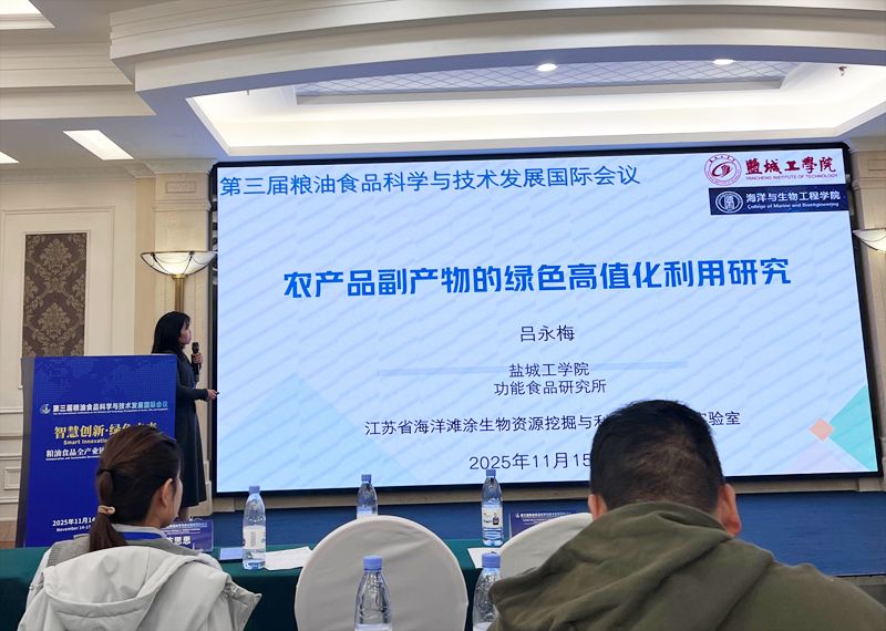 会议上,吕永梅博士以《农产品副产物的绿色高值化利用研究》为题作学术报告。报告结合盐城市农业大市的定位与独特滩涂资源背景,分析了麦麸、米糠、秸秆等农产品副产物产量庞大但利用率偏低的现状和原因。为破解这一问题,课题组采用化学-物理法、生物酶法及微生物发酵法,成功从上述副产物中提取功能性低聚糖—阿魏酰低聚糖,同时通过有机酸预处理技术,实现了麦麸全组分的高效利用。