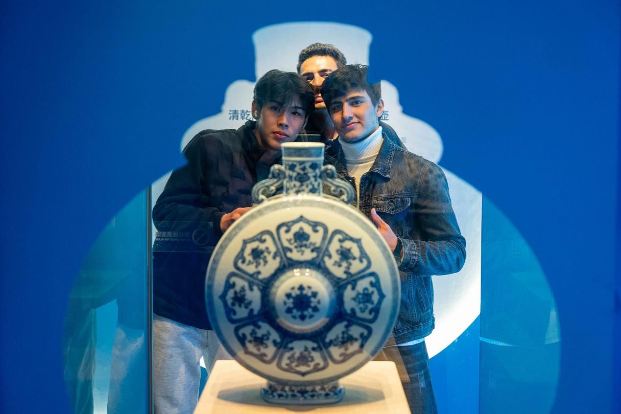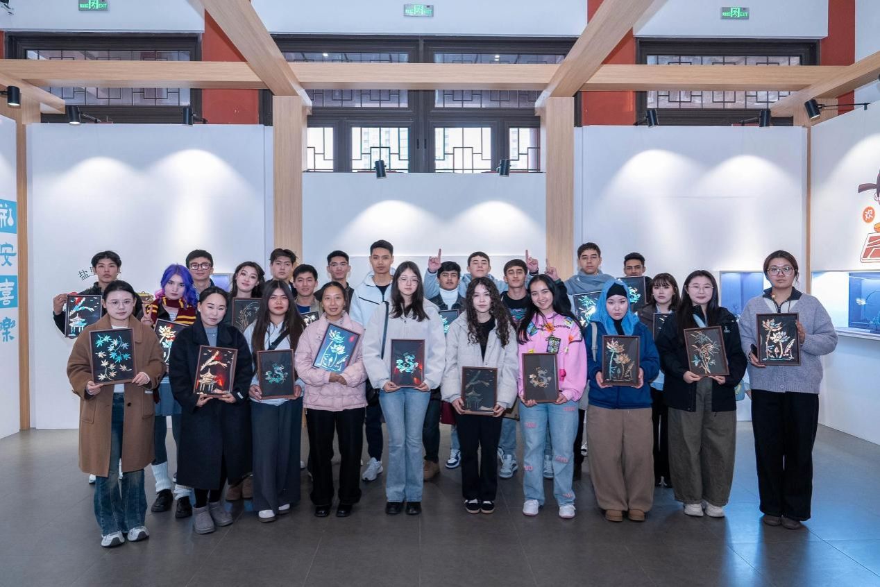 活动期间,留学生们在专业讲解的引导下,走进《青韵流转·瓷绘江山——青花瓷特展》。他们在青花瓷前驻足流连,认真聆听它们的由来和美好寓意,感受中国古代的审美智慧。在非遗展演中心,留学生们在老师的带领下亲手制作了独具特色的“非遗”烧箔画。从涂胶绘制到贴箔定形再到扫箔成画,大家认真创作,在一步一步的动手实践中,金箔随之焕发璀璨光彩,有代表祥瑞的中国龙,象征“事事如意”的柿子,代表纯洁高雅的莲花。在活动中,大家深刻体会了中国传统文化的底蕴。