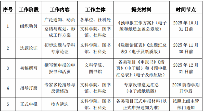 2.各申报单位负责制定本单位《2026年国家级和省部级社科研究项目预申报工作方案》(以下简称“预申报工作方案”),包括:2026年度国家社科基金、教育部项目、省社科基金等各类项目拟申报类别、人员以及选题论证、专家指导等工作的具体计划(时间表、实际工作内容、责任人、预期成效以及拟邀请专家姓名、职称、单位等)。请各单位于10月31日前将《预申报工作方案》(电子版、纸质版加盖公章)报送社科处。