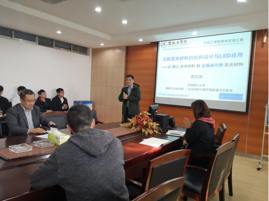 10月21日上午,在北校区知达楼省新型环保重点实验室会议室,华南理工大学夏志国教授应邀作题为“无机发光材料的结构设计与LED应用”的学术报告。报告会由产业技术研究院副院长姜瑞雨主持,重点实验室、材料科学与工程学院、化学与化工学院师生代表聆听报告。
