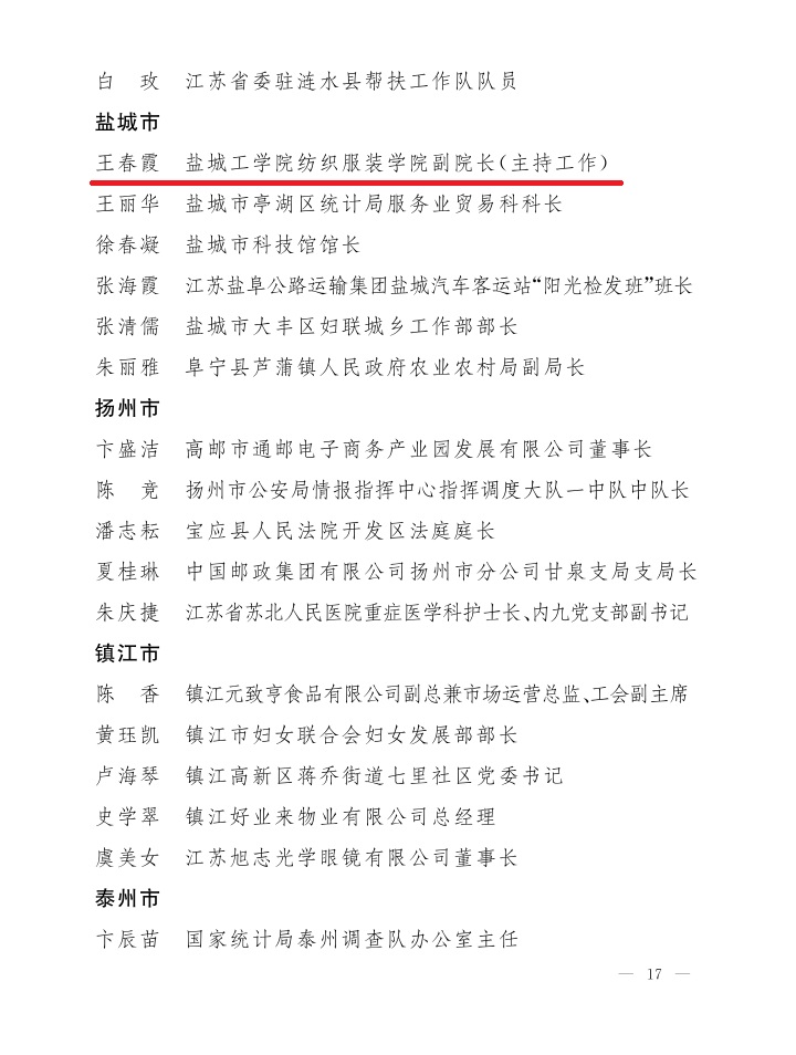 近日,江苏省城镇妇女“巾帼建功””活动领导小组、省妇女“双学双比”竞赛活动领导小组、省妇联联合下发《关于命名2021年度全省城乡妇女岗位建功先进典型的决定》(苏妇协[2021]14号),贝博纺织服装学院院长王春霞教授在2021年全省城乡妇女岗位建功活动中,荣获“江苏省巾帼建功标兵”称号。据悉,王春霞教授是此次入选的盐城市6位女性中的唯一一位高校女性。
