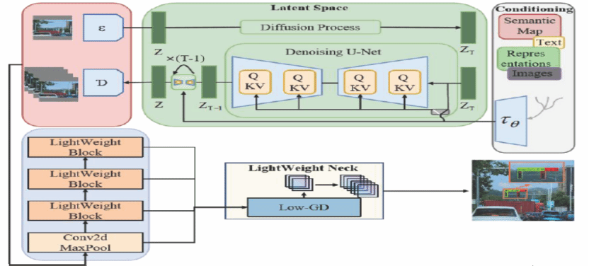 在模型的骨干部分,基于EfficientV2结构重新设计了一种新型的LightWeight Block:在Neck 部分,采用了Low-stage gather-and-distribute branch(LSGD)以取代传统的特征金字塔网络FPN。在交通信号灯数据集上提出了一种基于Stable Diffusion 的数据扩充方法,结构如图1所示。
