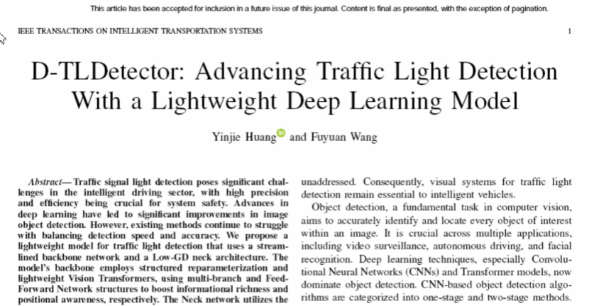 近日,机械优集学院研究生黄寅杰在智能交通领域顶级期刊IEEE Transactions on Intelligent Transportation Systems(中科院1区,JCR Q1区,TOP期刊,影响因子8.5)上发表了题为D-TLDetector: Advancing Traffic Light Detection With a Lightweight Deep Learning Model的研究论文。研究生黄寅杰为第一作者,导师王福元教授为通讯作者,bb贝博艾弗森官方网站为第一单位。