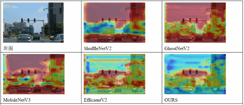 图11展示了五种不同轻量化模块的Grad-CAM 图进行比较。在这次比较中,Grad-CAM图是基于BackBone 最后一层的输出特征生成的。图片中红色区域越深表示网络对该部分特征的关注度越高,这些区域对模型的物体识别影响较大。通过观察和对比这些Grad-CAM 图,意到不同轻量化网络架构下热力图的特征分布和关注区域各异。