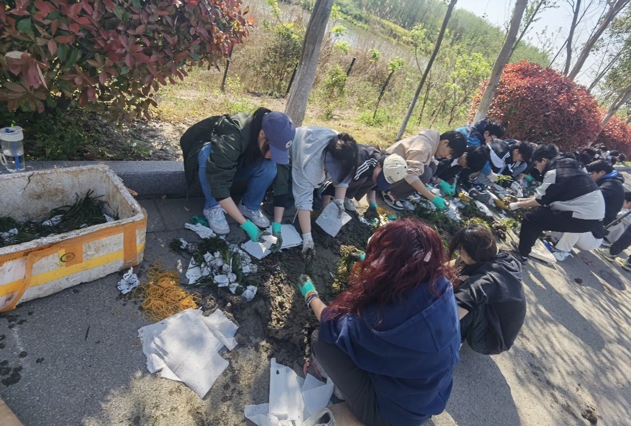 盐龙湖水源地作为盐城市重要饮用水源保护区,其水质安全直接影响数百万居民生活。活动过程中,企业导师杨殿谊、王玲现场讲解“无纺布包裹种植法”的技术原理,通过可降解无纺布包裹沉水植物根系,既能固定植株抵御水流冲击,又能为幼苗提供营养基质,显著提升存活率。学生在专业技术人员的指导下,分组开展苦草、轮叶黑藻等沉水植物的标准化种植,亲身实践“基质配制—植株固定—精准投放”全流程操作。