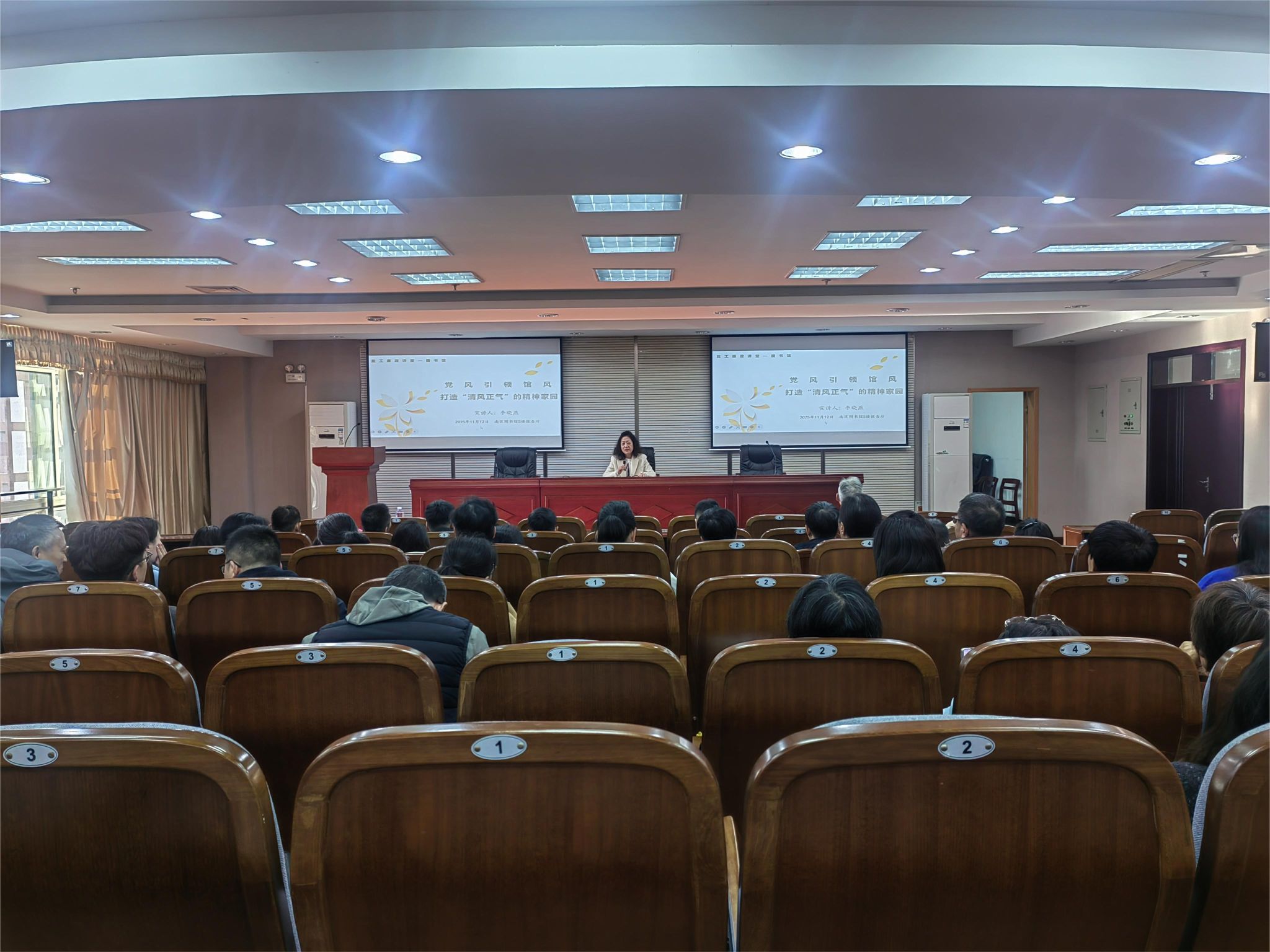 李晓燕以“党风引领馆风 打造图书馆‘清风正气’的精神家园”为主题,从“以优良党风带动民风向善”“以优良党风引领馆风向上”两个维度展开深入解读。她指出,作风是民心向背的风向标,直接关系党的形象和事业成败;领导干部的作风更是引领社会风气的重要标杆,是人民群众观察党风最直观的窗口。当前是“十四五”规划收官之年,也是我国发展加速转型升级的重要关口,面对艰巨繁重的改革发展任务,更需要以优良作风为各项工作提供坚实保障。结合图书馆工作实际,李晓燕强调,图书馆作为文化服务的前沿阵地,是滋养师生心灵、传递文明价值的重要窗口,“党风引领馆风”需落细落小、融入日常。要通过“藏书与书展并举”,以优质文献资源涵养师生精神世界,以特色主题书展传递正向价值;要“滋养与净化心灵并行”,在日常服务中既做知识的传递者,更做清风的守护者——通过“与读者并肩”的贴心服务,让每一项平凡工作都成为传递“清风正气”的载体,真正打造“读者舒心、环境清朗、文化润心”的“精神家园”。